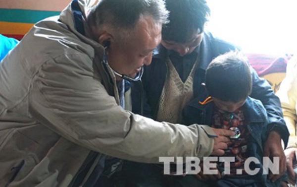 圖為北京安貞醫(yī)院心臟外科中心主任醫(yī)師趙鐵夫為已接受手術的先心病患兒旦增羅布聽診 攝影:吳建穎