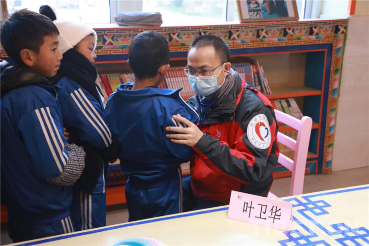 圖為解放軍總醫(yī)院心臟外科葉衛(wèi)華為當地學生聽診篩查