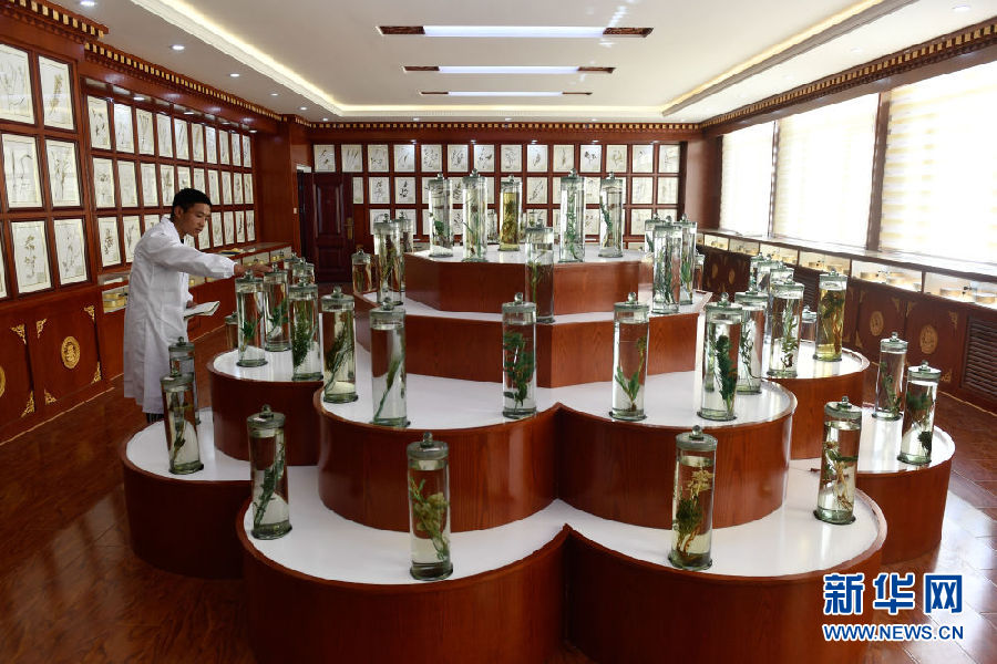 3月16日,在果洛藏族自治州職業(yè)技術學校,2020級藏醫(yī)醫(yī)療與藏藥專業(yè)學生華旦在草藥標本館內辨認藥材。新華社記者 張龍 攝
