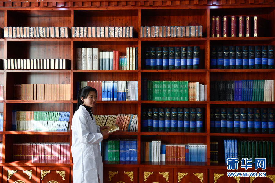 3月16日,在果洛藏族自治州職業(yè)技術學校,2020級藏醫(yī)醫(yī)療與藏藥專業(yè)學生德吉在借閱書籍。新華社記者 張龍 攝