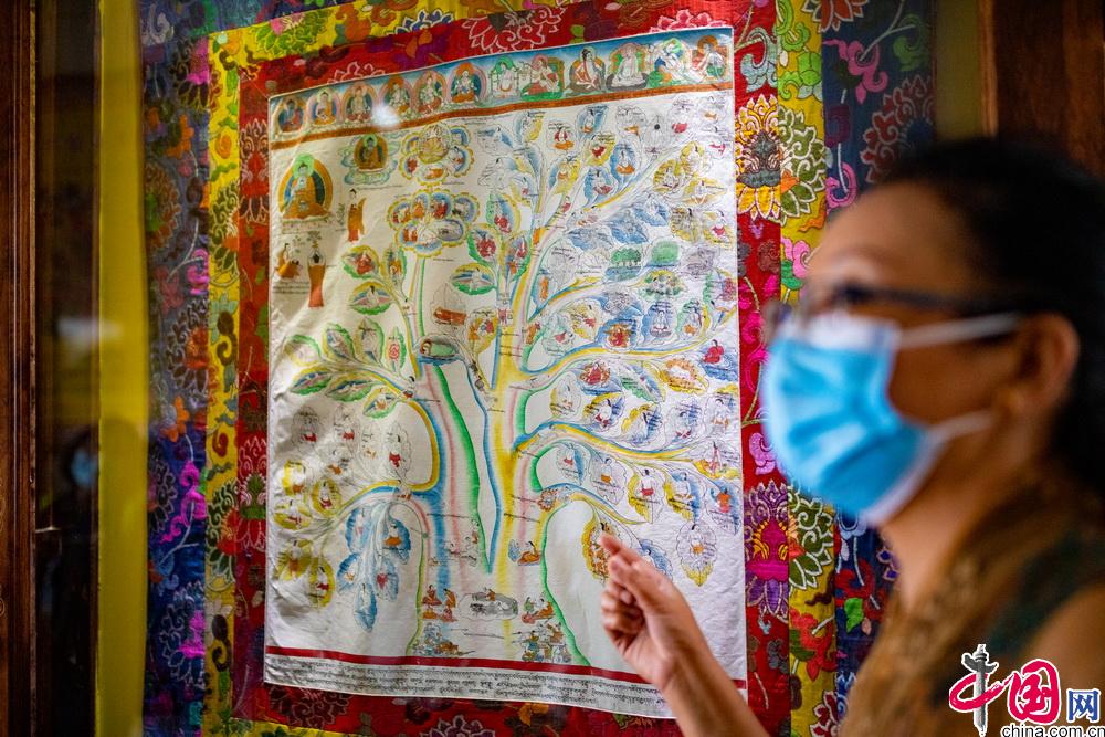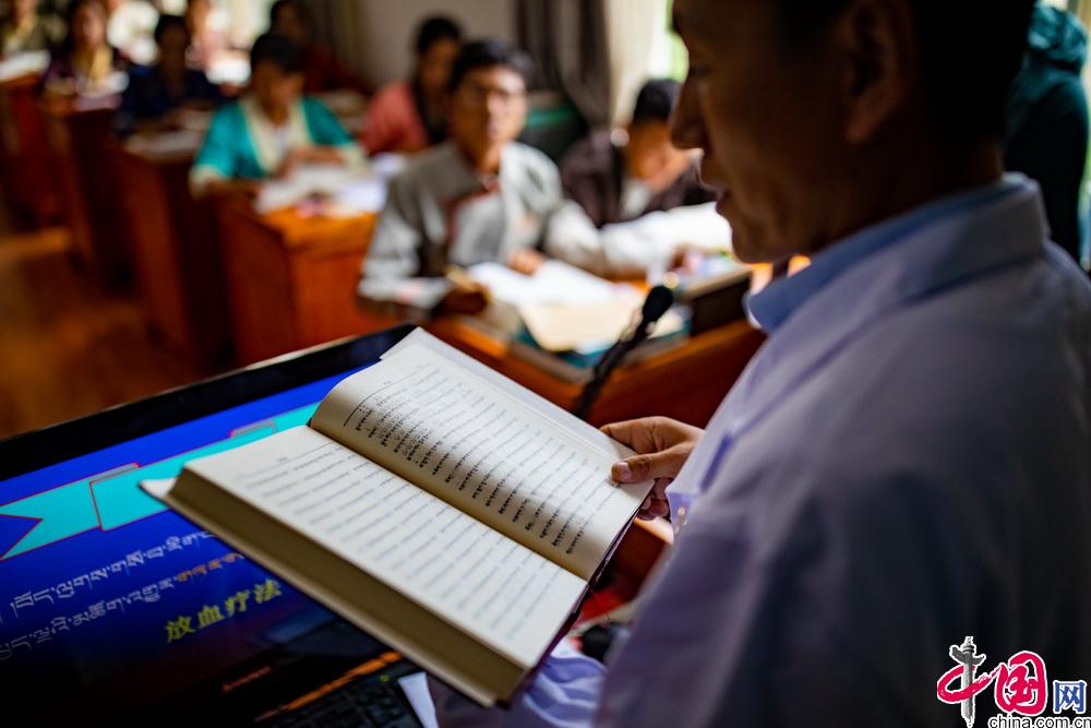 西藏藏醫(yī)藥大學開設特色鮮明的藏醫(yī)藥學唐卡教學課程?,F(xiàn)有醫(yī)學唐卡由十七世紀藏醫(yī)藥大家第司.桑杰嘉措創(chuàng)建,距今已有300多年的歷史。醫(yī)學唐卡用歸納、總結(jié)的方式將藏醫(yī)藥典籍《四部醫(yī)典》的主要內(nèi)容以“樹喻”方式繪示出來。成書于1300多年的《四部醫(yī)典》是藏醫(yī)藥學理論的根本大典。包括總則醫(yī)典、論述醫(yī)典、秘訣醫(yī)典和后續(xù)醫(yī)典。內(nèi)容涵蓋藏醫(yī)生理學、病理學、診斷學、治療學等基礎理論,細化了婦科、兒科、內(nèi)科、外傷等學科,包含了解剖學、護理學、藥學等眾多學科。圖為學校老師在對醫(yī)學唐卡進行講解。中國網(wǎng)記者 鄭亮攝