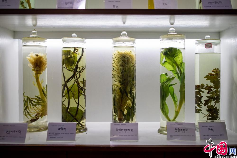 學校目前在藏藥新藥研發(fā)方面正在進行“四臣止咳液”、“降糖靈”、“清血康”等藏藥的研發(fā),同時研發(fā)出了藏藥牙膏、藏藥面膜等延伸產(chǎn)品。在藥材種植方面,積極開展了瀕危藏藥材的種植攻關工作,先后對喜馬拉雅紫茉莉、 船形烏頭、紅景天等瀕危藏藥通過項目進行育苗、種植等。圖為西藏藏醫(yī)藥大學內(nèi)所陳列的藏藥標本。中國網(wǎng)記者 鄭亮攝