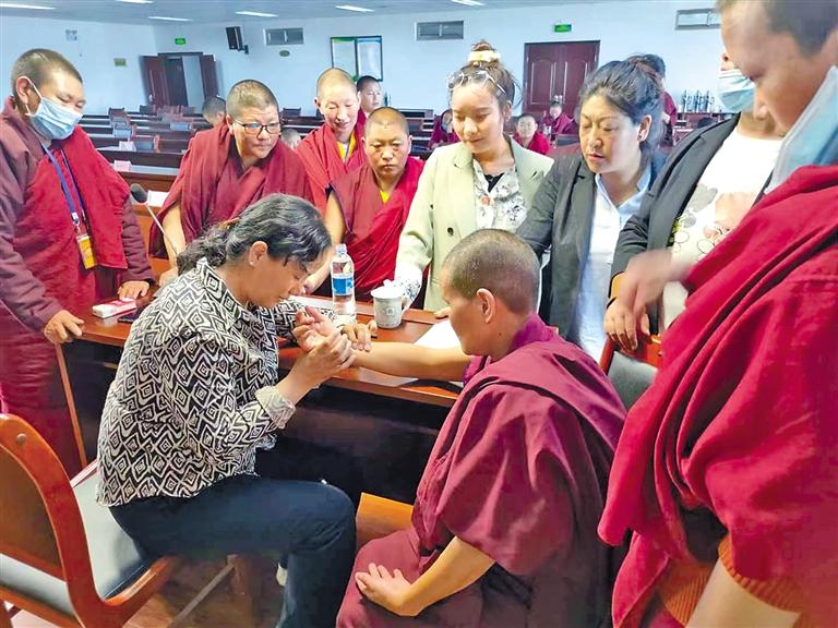 圖為明吉措姆教授在基層為僧尼群眾號脈。