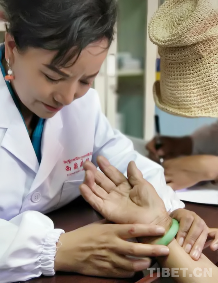 圖為全國政協(xié)委員、西藏藏醫(yī)藥大學(xué)副教授明吉措姆為患者診療
