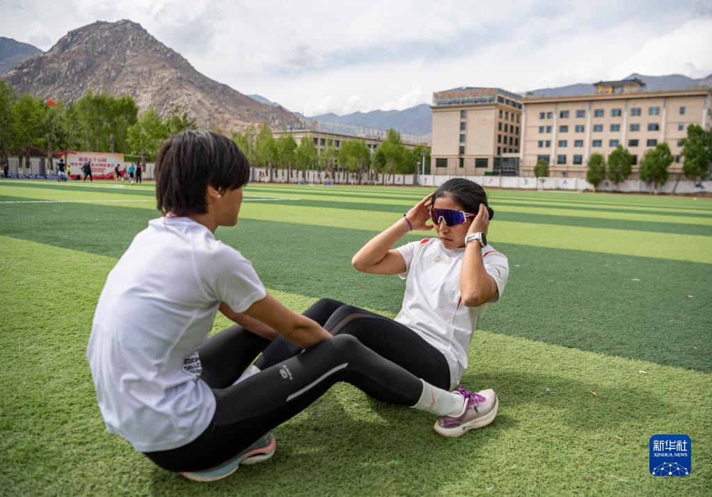 在西藏自治區(qū)體育運(yùn)動技術(shù)學(xué)校,玉珍拉姆(左)和隊(duì)友次旦玉珍在訓(xùn)練后聊天(4月29日攝)。新華社記者 孫非 攝