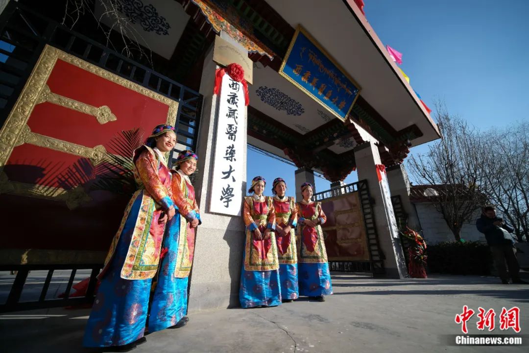 2018年12月28日,西藏藏醫(yī)學(xué)院更名為西藏藏醫(yī)藥大學(xué)揭牌儀式在拉薩舉行,該校學(xué)生在校門前合影留念。何蓬磊 攝