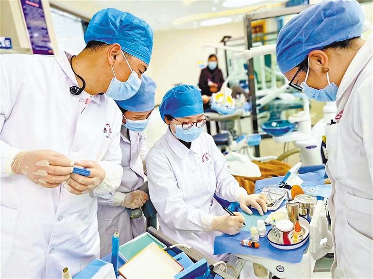 湖南援藏醫(yī)生、山南市藏醫(yī)醫(yī)院口腔科副主任醫(yī)師徐麗(中)圍繞橡皮障隔離術(shù)進行實操帶教。記者 劉楓 攝