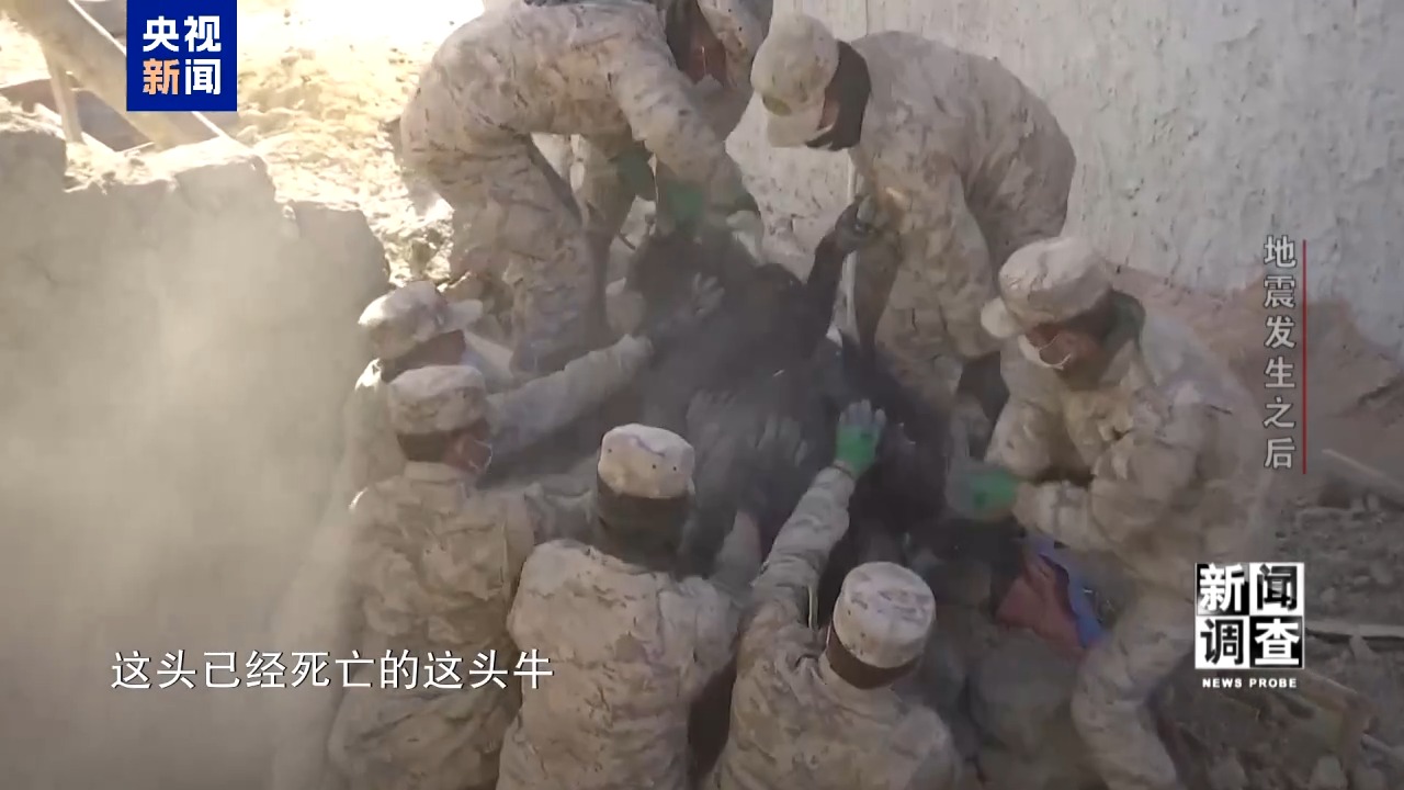 總臺(tái)央視記者 張騰飛:我現(xiàn)在在通來(lái)村洛桑大哥家牛圈的旁邊,地震對(duì)這里建筑造成的損毀情況還是非常嚴(yán)重的?,F(xiàn)在武警戰(zhàn)士正在清理的,就是牛圈里已經(jīng)死亡的牛。他告訴我,這個(gè)牛圈之前一共有5頭牛,當(dāng)時(shí)地震來(lái)的時(shí)候有兩頭牛跑了出去,有3頭牛被埋壓在下面。在現(xiàn)場(chǎng)已經(jīng)開(kāi)始有腐爛的味道了,正是因?yàn)檫@樣,我們要加緊把這些死亡的牲畜進(jìn)行清理,從而來(lái)防止疫病的滋生。全村現(xiàn)在有100多頭的這種牛羊死亡,也是有多方的力量在加緊來(lái)幫助他們清理。