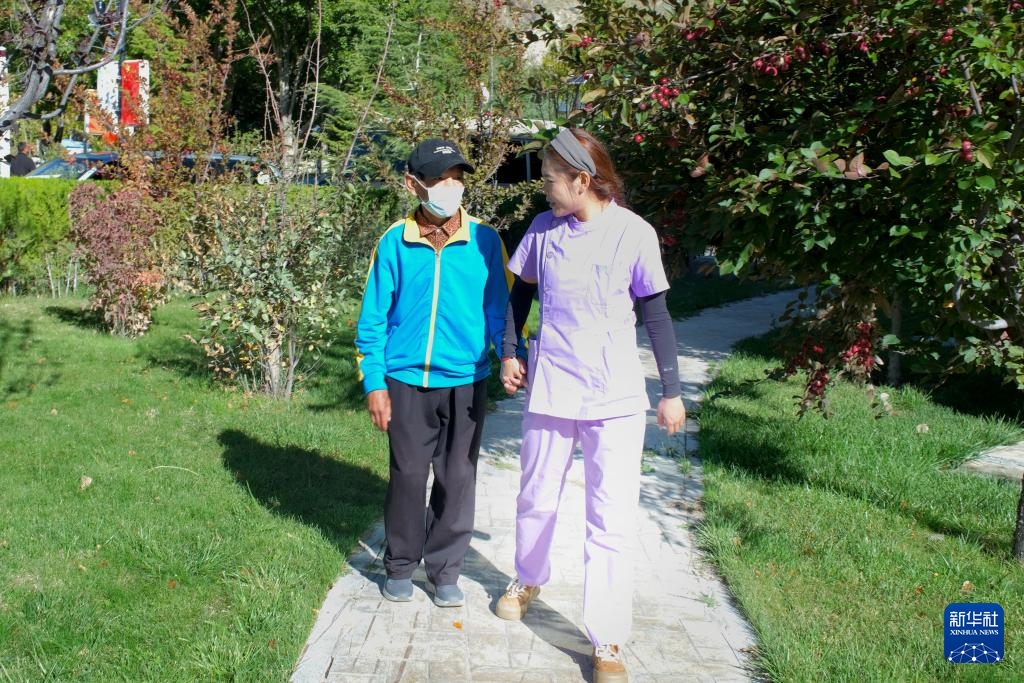 在西藏自治區(qū)殘疾人托養(yǎng)服務(wù)中心,護(hù)理主管德吉(右一)帶著拉瑪散步(9月23日攝)。新華社記者周昱龍 攝