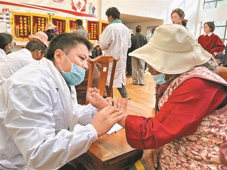 圖為活動現(xiàn)場,醫(yī)生正在為老人把脈問診。記者 拉巴桑姆 攝
