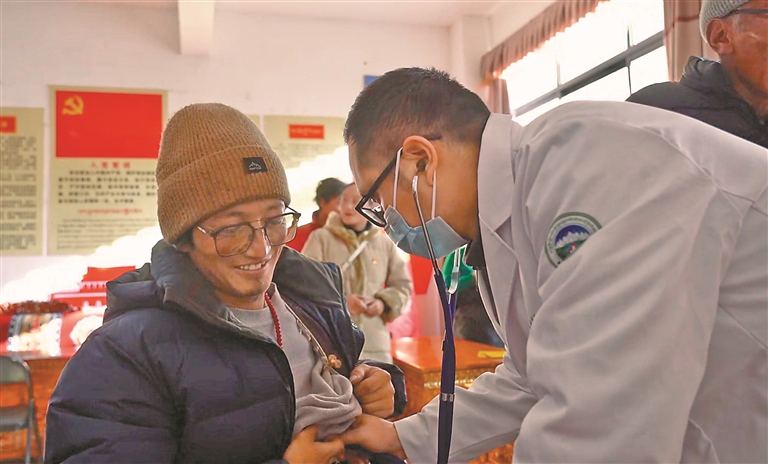 圖為援藏醫(yī)療專家為群眾聽診。 記者 萬靖 攝
