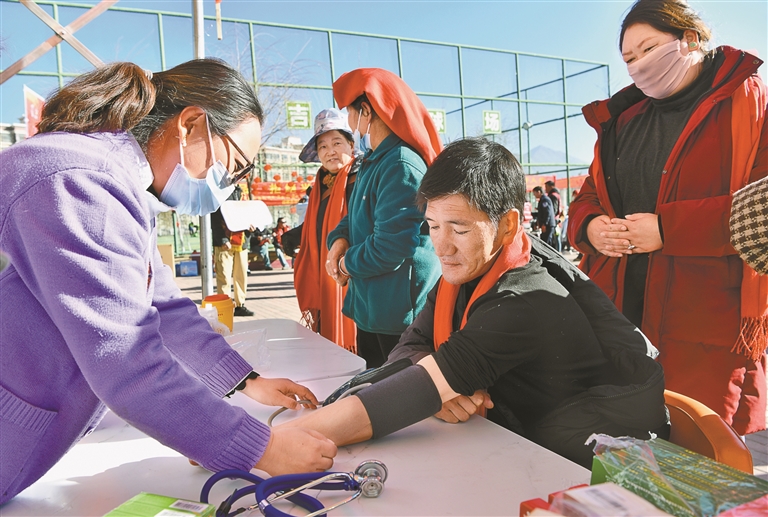 圖為在健康安全宣傳服務(wù)區(qū),工作人員為群眾免費量血壓。記者 王敏 攝