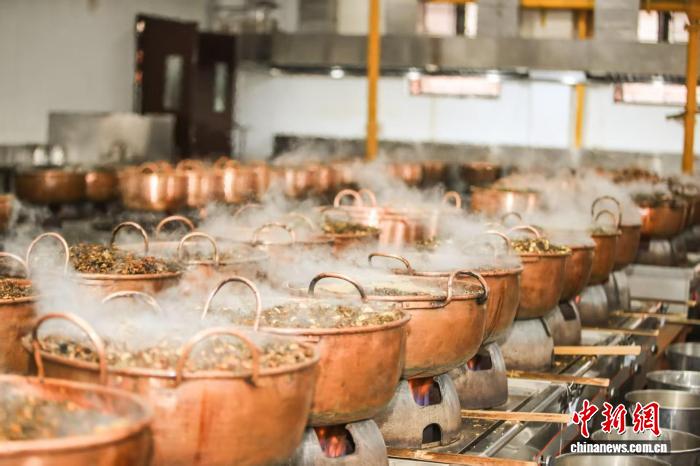 7日,岳陽醫(yī)院膏方制作室內,100口紫銅鍋的爐火熊熊燃燒。(岳陽醫(yī)院供圖)
