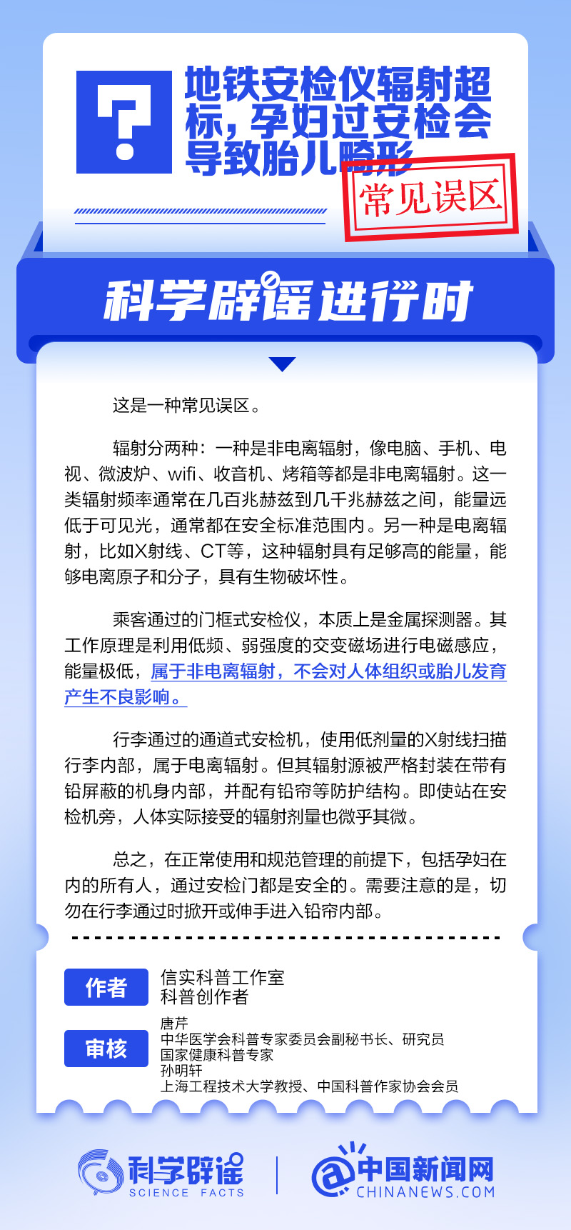 乘客通過(guò)的門框式安檢儀,本質(zhì)上是金屬探測(cè)器。其工作原理是利用低頻、弱強(qiáng)度的交變磁場(chǎng)進(jìn)行電磁感應(yīng),能量極低,屬于非電離輻射,不會(huì)對(duì)人體組織或胎兒發(fā)育產(chǎn)生不良影響。行李通過(guò)的通道式安檢機(jī),使用低劑量的X射線掃描行李內(nèi)部,屬于電離輻射。但其輻射源被嚴(yán)格封裝在帶有鉛屏蔽的機(jī)身內(nèi)部,并配有鉛簾等防護(hù)結(jié)構(gòu)。即使站在安檢機(jī)旁,人體實(shí)際接受的輻射劑量也微乎其微。在正常使用和規(guī)范管理的前提下,包括孕婦在內(nèi)的所有人,通過(guò)安檢門都是安全的。(來(lái)源:@科學(xué)辟謠 中國(guó)新聞網(wǎng)微博)