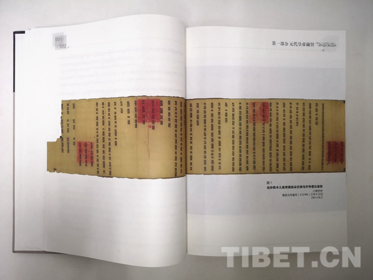 圖為《西藏自治區(qū)檔案館館藏蒙滿文檔案精選①》中的八思巴字《也孫鐵木兒皇帝頒給朵甘類烏齊寺僧眾諭旨》。攝影:李元梅