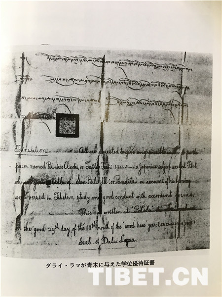 十三世達賴喇嘛授予給青木文教的學業(yè)證明