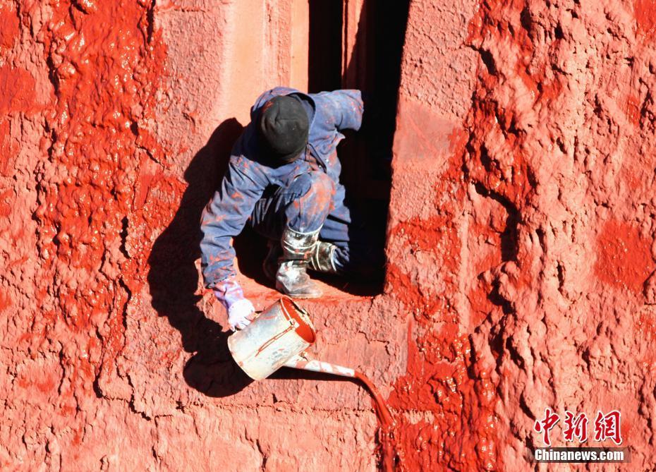 布達(dá)拉宮管理處維修科工作人員開(kāi)始對(duì)紅宮進(jìn)行粉刷。中新社記者 趙延 攝