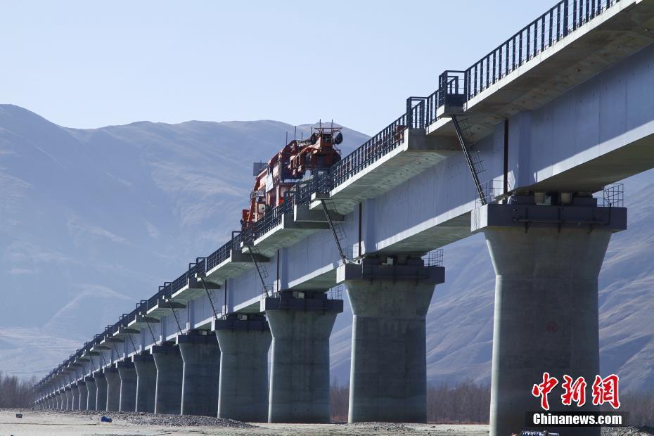 11月26日,中鐵十一局三公司拉林鐵路項(xiàng)目部鋪架二隊(duì)工人鋪設(shè)拉林鐵路首跨貢嘎雅魯藏布江特大橋鐵軌。拉林鐵路共計(jì)上跨雅魯藏布江16處,貢嘎雅魯藏布江特大橋全長(zhǎng)5727米,為拉林鐵路全線最長(zhǎng)橋梁。拉林鐵路起于西藏自治區(qū)首府拉薩,終點(diǎn)為林芝市,拉林鐵路新建正線鋪軌403.14千米,運(yùn)營(yíng)長(zhǎng)度435.48千米。中新社記者 趙朗 攝