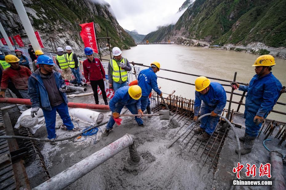 6月20日,中鐵廣州工程局工人在位于西藏自治區(qū)加查縣的藏木特大橋工地進行混凝土澆筑作業(yè)。中新社記者 何蓬磊 攝