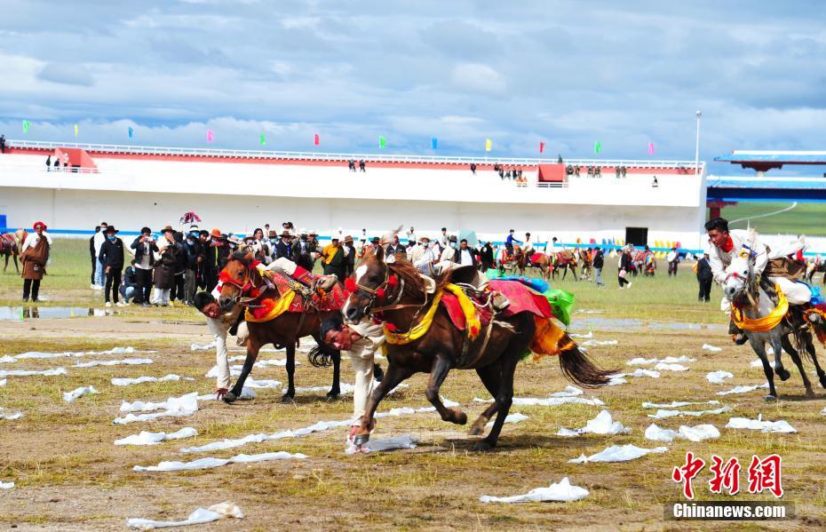 8月11日,藏北騎手表演跑馬拾哈達。8月10日,2020年那曲羌塘恰青格薩爾賽馬藝術節(jié)在西藏那曲市開幕。中新社記者 張偉 攝