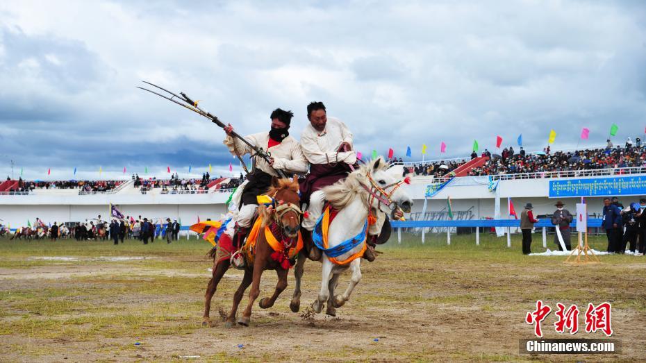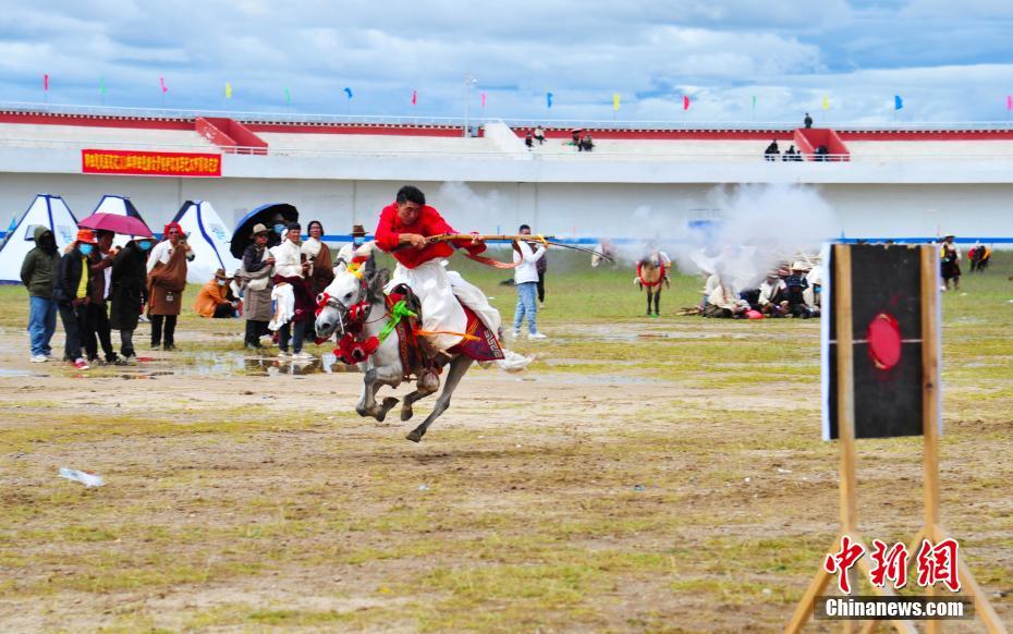 8月11日,藏北騎手表演跑馬射擊。8月10日,2020年那曲羌塘恰青格薩爾賽馬藝術節(jié)在西藏那曲市開幕。中新社記者 張偉 攝