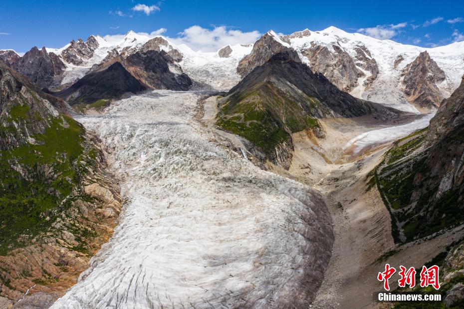 約雄冰川距離巴青縣城約85公里,冰川所在區(qū)域?qū)儆趪壹墲竦乇Wo區(qū),主要由冰川下游冰緣區(qū)的湖泊水域、河流、沼澤化草甸及流域匯水區(qū)的部分水源林地組成。圖為航拍約雄冰川。 何蓬磊 攝