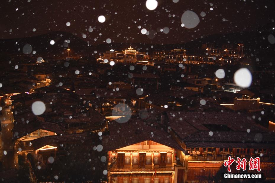 11月22日,正值中國二十四節(jié)氣中的“小雪”節(jié)氣,云南香格里拉市迎來降雪,夜色中的獨克宗古城美如畫。中新社記者 劉冉陽 攝