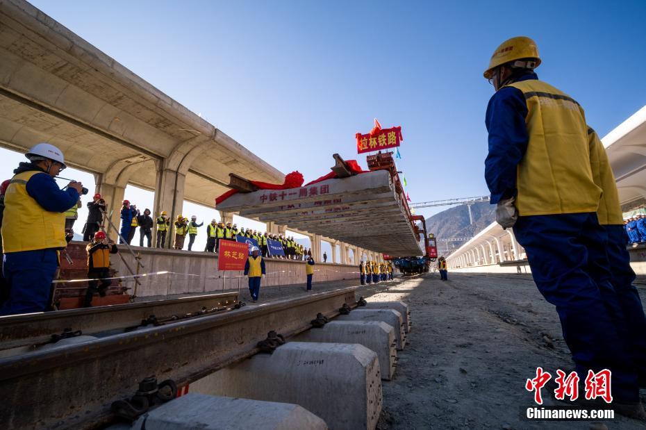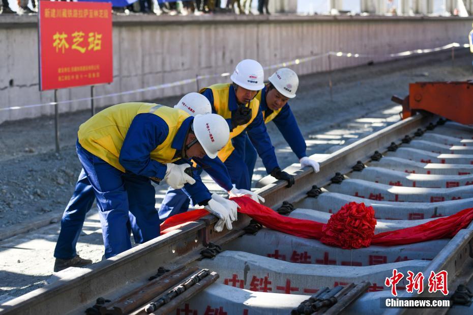 12月31日,拉林鐵路最后一段軌排鋪設(shè)現(xiàn)場。當日,在西藏林芝市尼洋河畔的新建林芝火車站,川藏鐵路拉薩至林芝段(拉林鐵路)最后一段軌排順利鋪設(shè),這標志著拉林鐵路399.61公里的正線軌道全部鋪通,西藏東南地區(qū)結(jié)束無鐵路歷史。拉林鐵路起自西藏自治區(qū)首府拉薩,終點為林芝市,正線全長435.5公里,新建正線403.1公里,系西藏首條電氣化鐵路,設(shè)計行車速度為160km/h,全線計劃于2021年6月30日建成通車。中新社記者 何蓬磊 攝