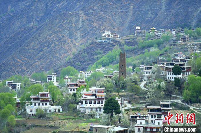 山坡上一幢幢藏式樓房灑落在梨花、綠樹(shù)叢中美如畫(huà)。劉忠俊 攝