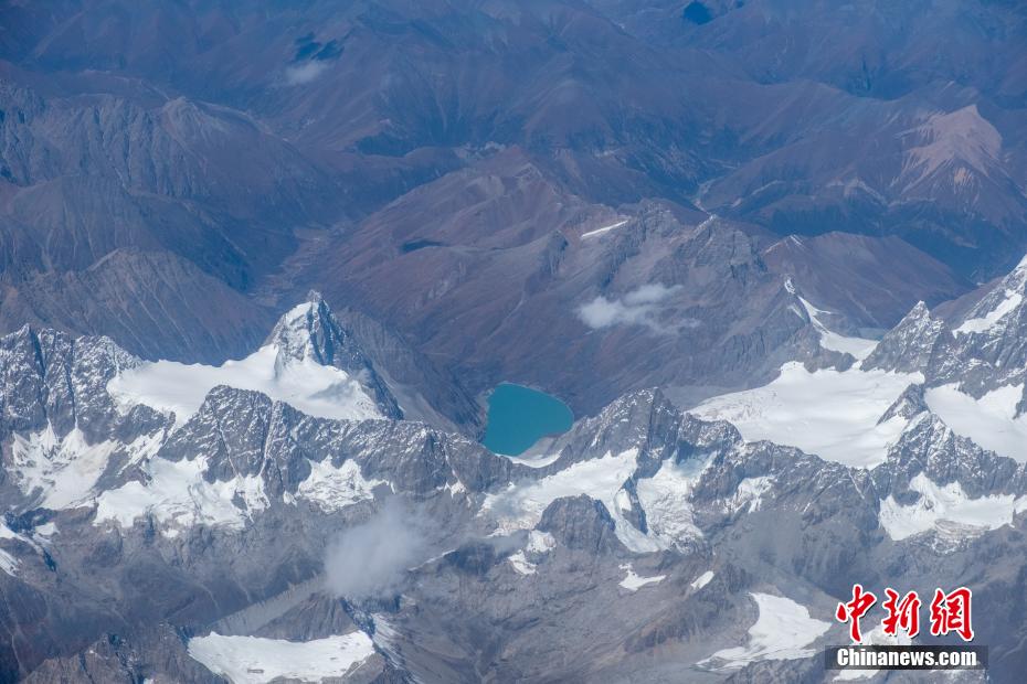 近日,記者從四川成都飛往西藏拉薩的航班上俯瞰青藏高原,一覽高原冰川、湖泊、河流等秀麗風(fēng)光。圖為10月14日,進藏航班途徑冰川上方,冰川腳下為兩條冰舌。江飛波 攝