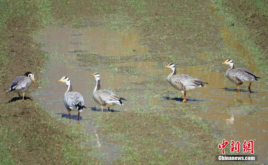 圖為11月12日,斑頭雁、赤麻鴨等鳥類在西藏山南市扎囊縣境內(nèi)的農(nóng)田內(nèi)漫步。冉文娟 攝