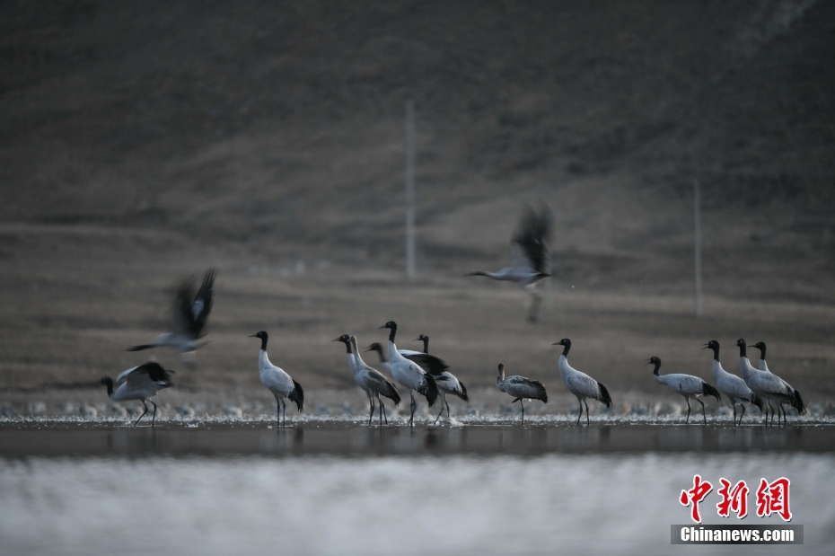 11月23日,在西藏自治區(qū)拉薩市林周縣春堆鄉(xiāng)虎頭山水庫黑頸鶴群覓食。由于適宜的環(huán)境和充足的食物,冬季的拉薩市林周縣成了越來越多黑頸鶴聚集的家園。中新社記者 貢嘎來松 攝