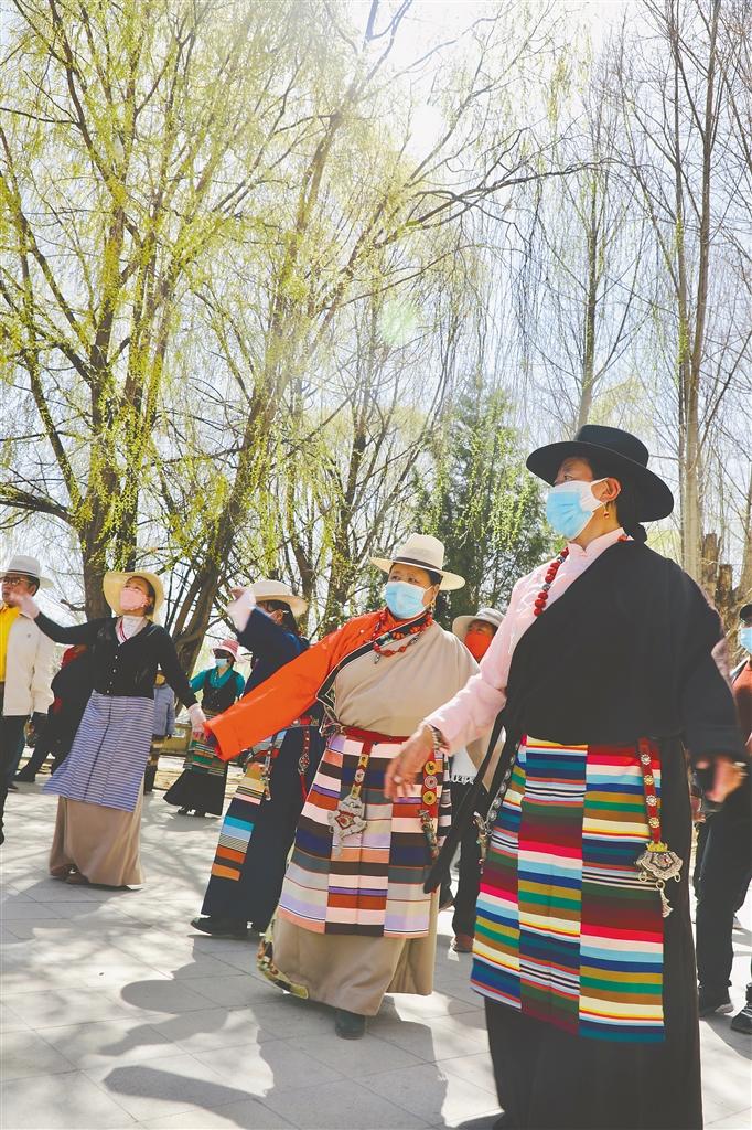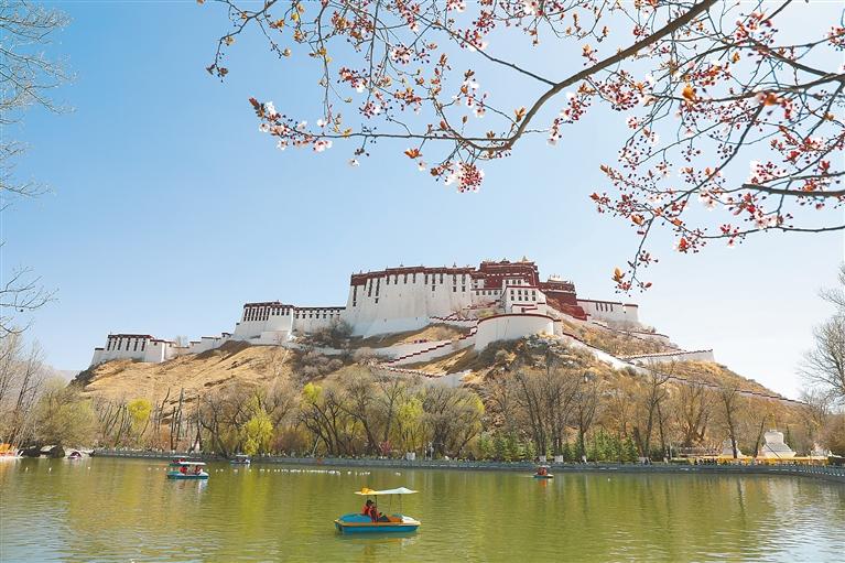 經過春意潤染的城市,處處呈現(xiàn)出純凈明朗的美。布達拉宮的金頂反射著耀眼的金光,布達拉宮廣場前綠草茵茵,人工湖旁的垂柳被和煦的春風吹得飄飄揚揚,羅布林卡里的古樹也開始抽出鮮嫩的枝葉,繁華的八廓街上,三五成群的轉經老人坐在路邊歇息……