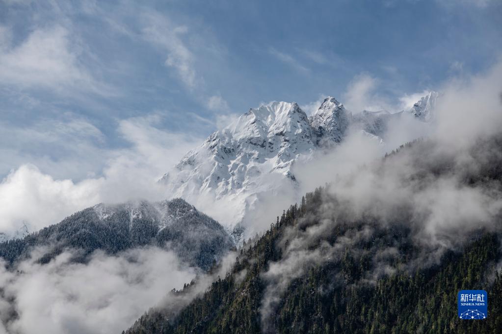 這是在波密縣拍攝的桃花掩映下的雪山(4月18日攝)。新華社記者 晉美多吉 攝