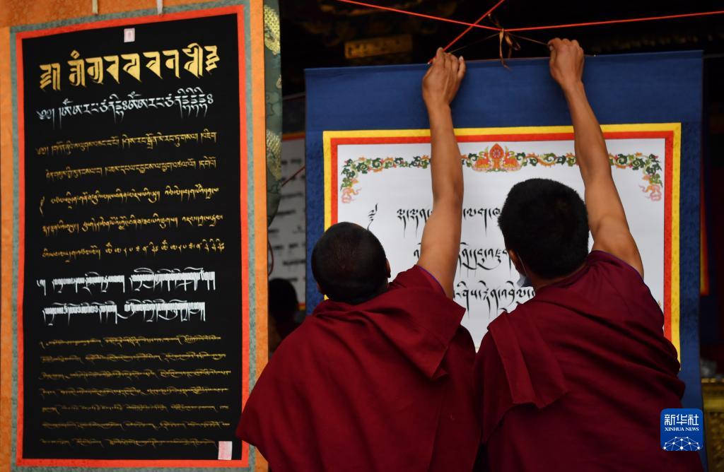 4月28日,拉薩大昭寺僧人在布展。新華社記者 覺果 攝