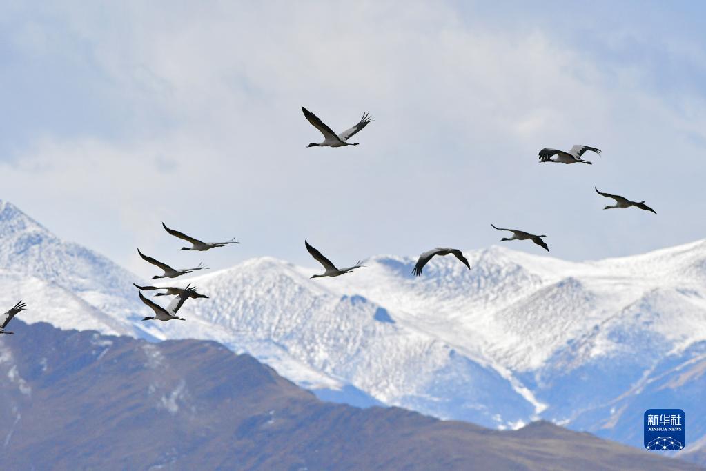 黑頸鶴群飛過(guò)林周縣強(qiáng)嘎鄉(xiāng)境內(nèi)山梁(11月6日攝)。新華社記者 姜帆 攝