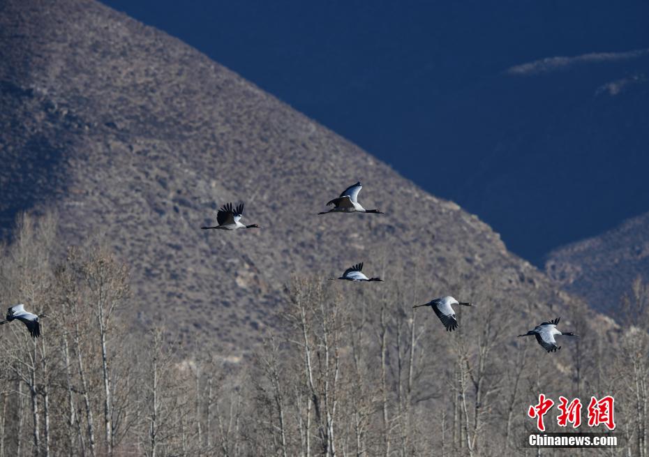 每年的10月底,成群的黑頸鶴飛到西藏拉薩市林周縣越冬,在拉薩市林周縣周邊的湖泊濕地度過5個(gè)月的“閑云野鶴”生活,次年三四月份再飛向藏北草原繁殖。黑頸鶴是世界上唯一一種高原鶴類。具有足長、喙長、頸長的典型涉禽類特征,適合在沼澤地里行走。黑頸鶴的頸、尾為黑色,體羽為灰白色。黑頸鶴是國家一級(jí)保護(hù)動(dòng)物。目前,每年到林周縣越冬的黑頸鶴已達(dá)2000只左右。圖為黑頸鶴在林周境內(nèi)的農(nóng)田上空飛翔。 貢嘎來松 攝