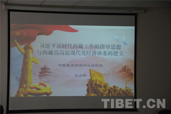 圖為王小彬作題為《習(xí)近平新時(shí)代西藏工作的指導(dǎo)思想與西藏高高原現(xiàn)代化經(jīng)濟(jì)體系的建立》的報(bào)告。