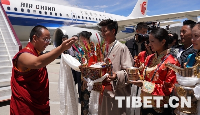 7月17日,十一世班禪乘坐的飛機(jī)抵達(dá)拉薩貢嘎機(jī)場時(shí),西藏自治區(qū)黨委常委、統(tǒng)戰(zhàn)部部長旦科站在歡迎隊(duì)伍最前面迎接,敬獻(xiàn)哈達(dá),握手致禮,表達(dá)西藏自治區(qū)黨委、政府的歡迎。