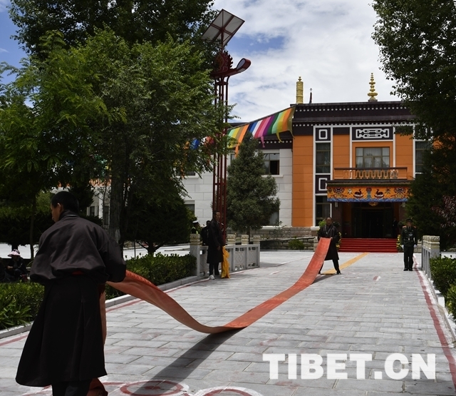 在位于拉薩市區(qū)的班禪行宮雪林多吉頗章主殿前,僧人們提前繪制了金剛結(jié)等吉祥圖案,一條尺許寬的地毯從歡迎隊(duì)伍處一直延伸到主殿門前。