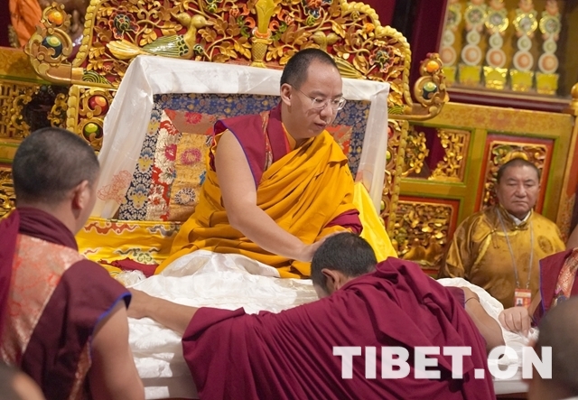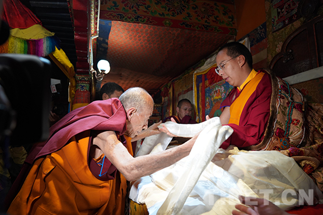 十一世班禪在拉讓日光殿接受扎寺高僧朝拜。攝影:王淑