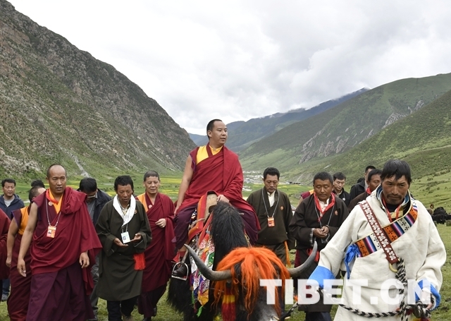 在眾人簇?fù)硐买T著牦牛的十一世班禪。攝影:王淑