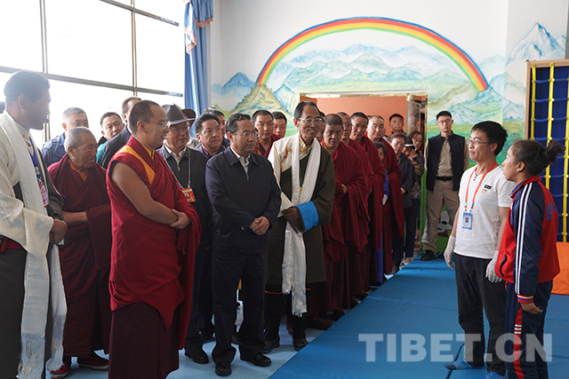 圖為十一世班禪在學(xué)校康復(fù)區(qū)與工作人員交流。攝影:王淑