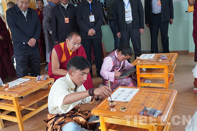 圖為十一世班禪仔細查看殘疾學(xué)生學(xué)習(xí)情況。攝影:扎西