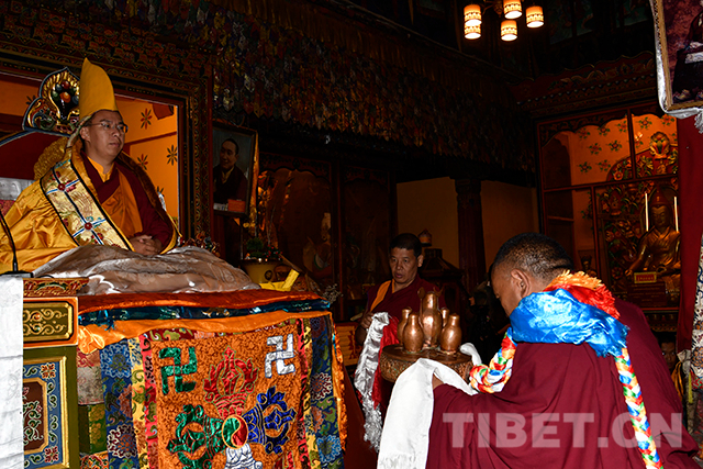 十一世班禪頭戴金色佛冠,由手持香炷的僧人引領(lǐng),緩緩步入杜康大殿。在僧人們渾厚的誦經(jīng)聲中,十一世班禪登上法座,領(lǐng)誦經(jīng)文。寺廟僧人向十一世班禪敬獻(xiàn)曼扎等,十一世班禪微笑接過后,為僧人摸頂賜福,并發(fā)放布施、供齋茶齋飯。隨后,十一世班禪朝拜珍珠唐卡殿。