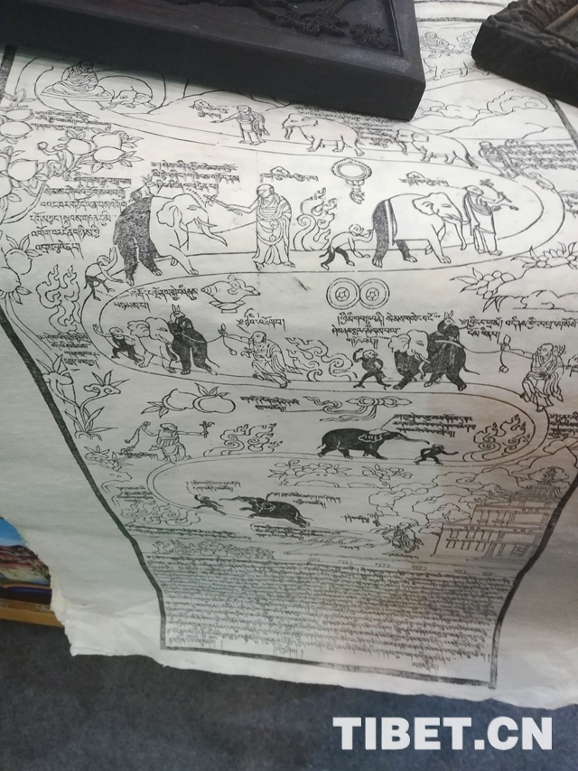 色覺的版雕拓印成品描繪的是著名的佛經(jīng)故事《調(diào)象圖》,講的是“九住心”的故事。最初,猴子在前大象在后,兩者都是黑色,經(jīng)過一路修行,漸漸脫俗出塵身體慢慢變白,但路上出現(xiàn)的桃子等寓意誘惑不斷,猴子經(jīng)不住誘惑,漸漸落后于大象,最終未能修得正果。通過連環(huán)畫的形式,講述了深刻而富有內(nèi)涵的故事,大象、猴子和僧人惟妙惟肖的肢體語言和特色鮮明的形象傳遞出一個(gè)包羅萬象的世界,令人驚嘆不已。