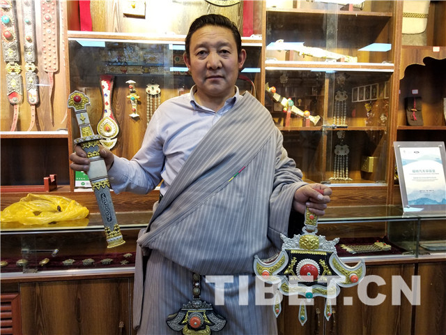 記者前年見(jiàn)過(guò)更求普措打制的“藏刀王”。藏刀王長(zhǎng)約1.6米,刀鞘上鑲嵌有各種珍珠瑪瑙,造型美觀,讓人嘆為觀止。這次見(jiàn)他身著一身近似西藏管家的藏裝,那發(fā)型和淡淡胡子更讓感到一絲神秘。他話不多,但是展示的展品很多,最有名的還是傳承自家鄉(xiāng)稱多縣賽河鄉(xiāng)阿朵村的鐵器制品藏刀和火鐮。