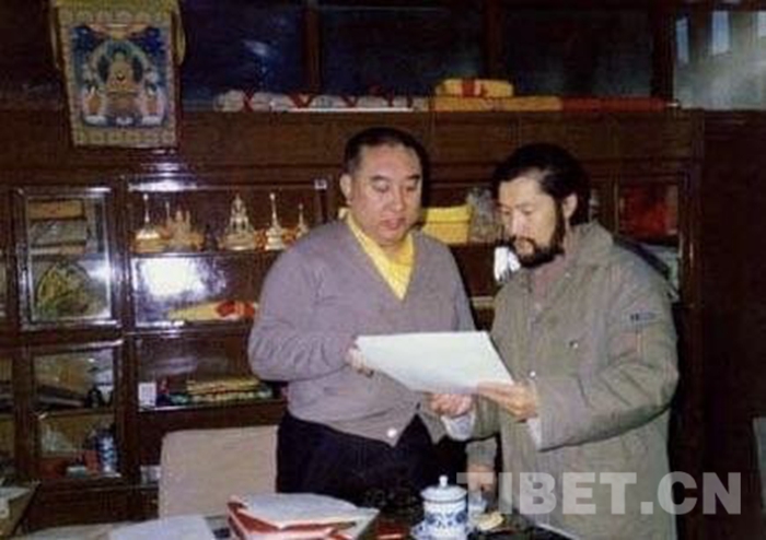圖為1987年初,十世班禪大師和畫(huà)家洛松向秋探討援助西藏發(fā)展基金會(huì)徽標(biāo)事宜。