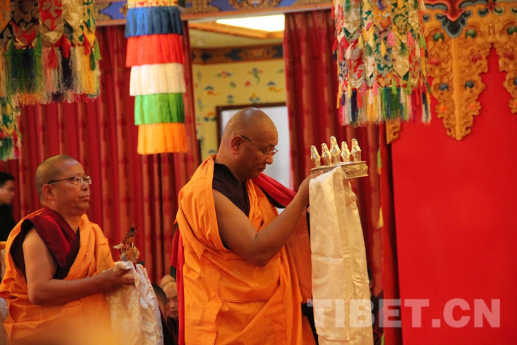 圖為土多申格副院長(zhǎng)帶領(lǐng)經(jīng)師代表和學(xué)員代表,虔誠(chéng)地向十一世班禪敬獻(xiàn)曼扎、佛像、佛塔、佛經(jīng)。攝影:孫健