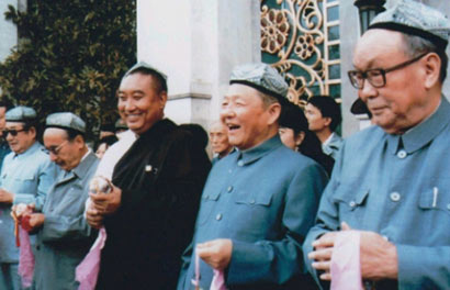 圖為習(xí)仲勛(右二)與烏蘭夫(右一)、十世班禪(右三)、賽福鼎?艾則孜(右四)、楊靜仁(右五)在北京民族文化宮。圖片來(lái)源:《中國(guó)西藏》雜志